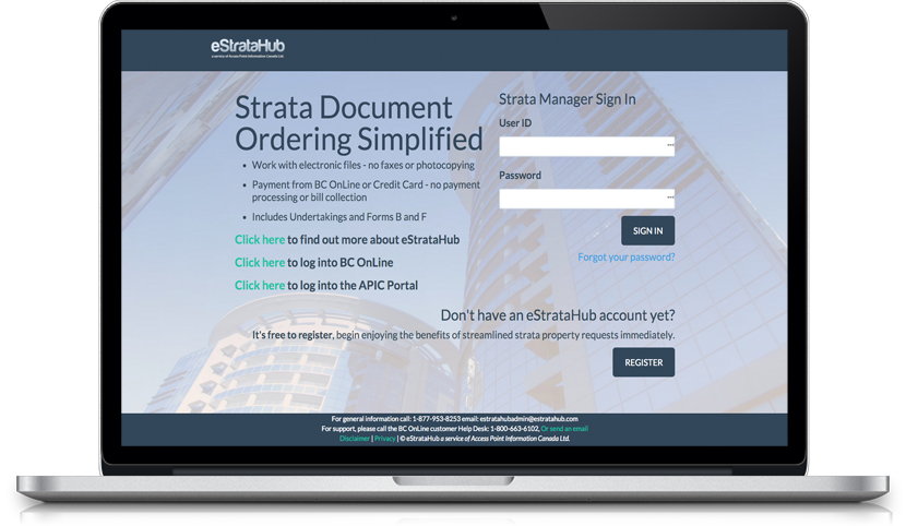 eStrataHub was created and is operated by Access Point Information Canada Ltd. in order to address the universal demand for a faster, more efficient way to manage strata document orders.